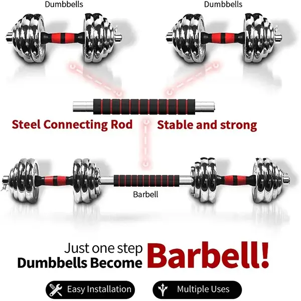 💪【 دامبل قابل للتعديل 】يمكنك ضبط وزن الدمبل وفقًا لاحتياجاتك، تأتي مجموعة الدمبل مع بار توصيل يمكنك تحويله إلى قضيب حديد في بضع ثوانٍ
